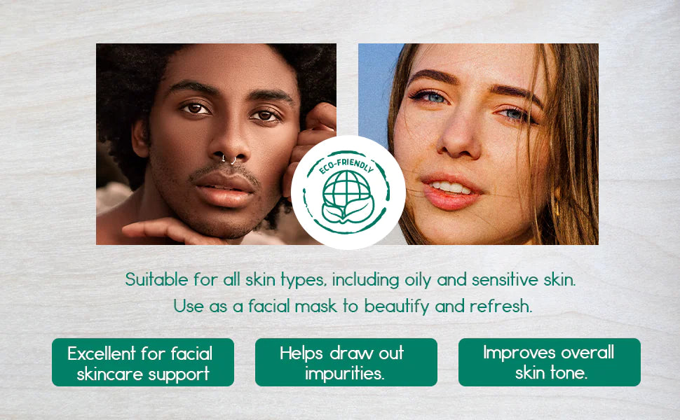 SUITABLE: all skin types, including oily and sensitive skin. Use as a facial mask to beautify and refresh. Excellent for facial skincare support and deep pore cleansing. It effectively reduces the appearance of blackheads, whiteheads, and impurities.